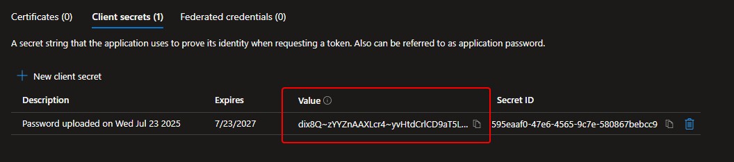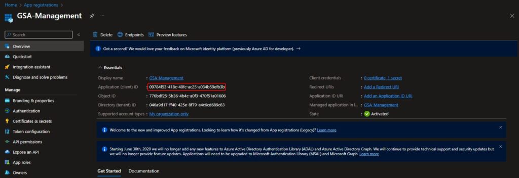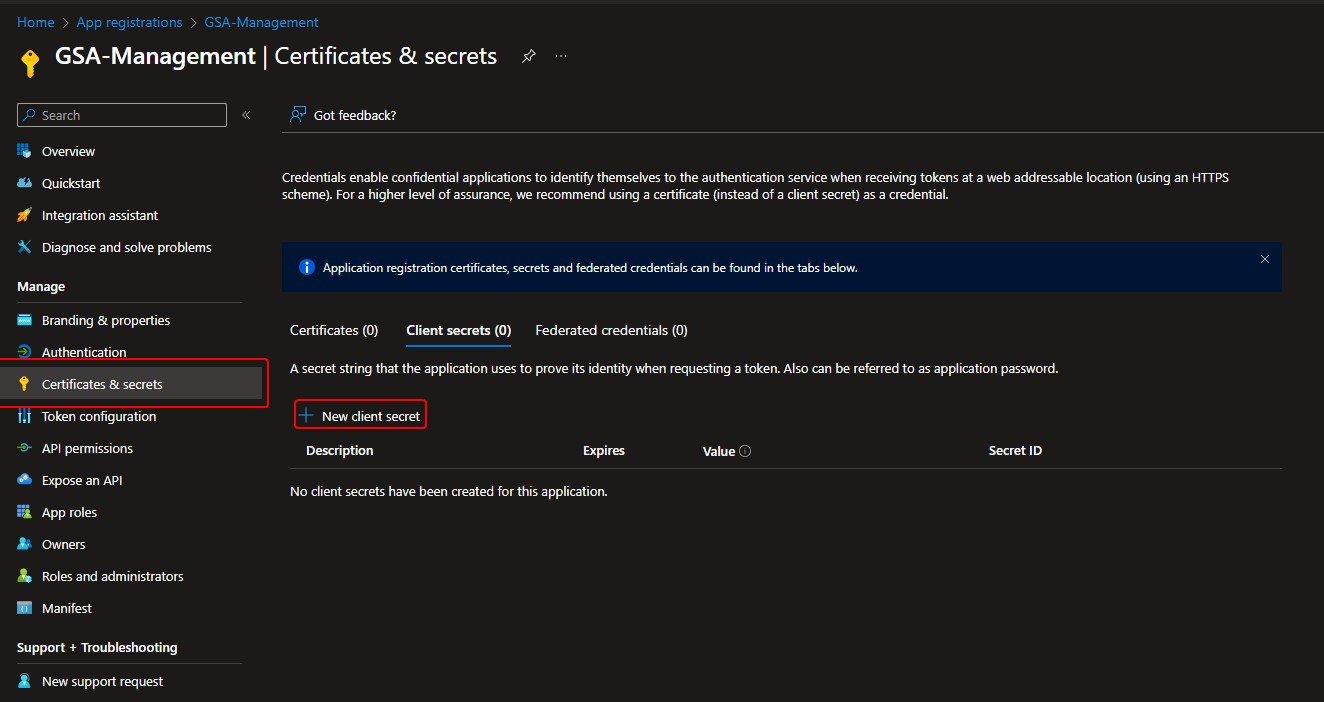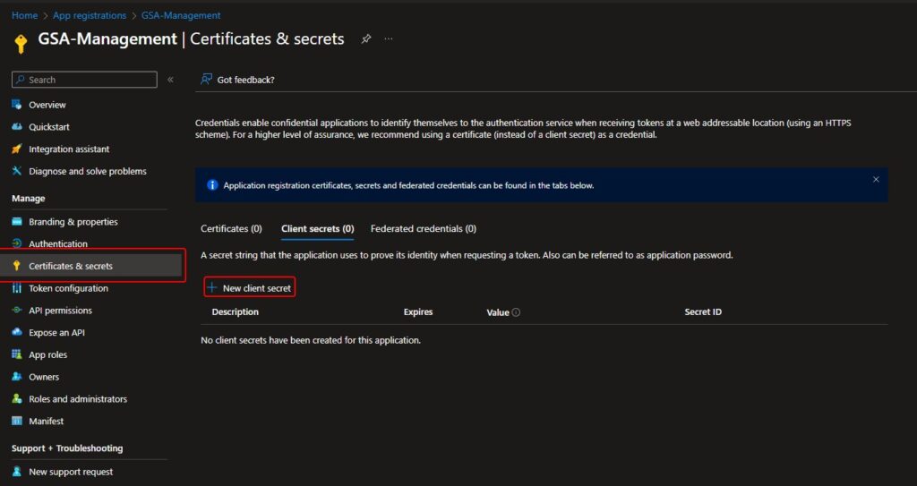 Make a note of the application id, we are going to need that later. Click certificates and secrets and click new client secret