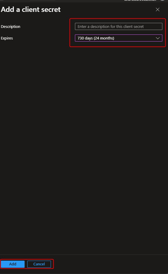 Select when the client secret should expire. Make a note of the client secret now, it will only be visible this one time.
