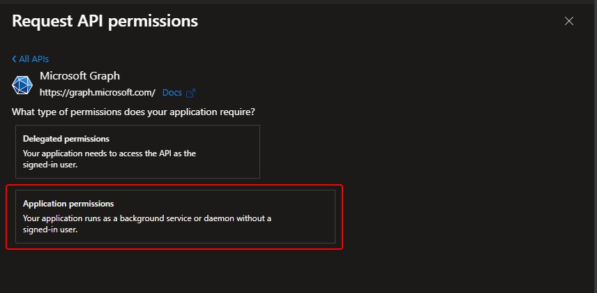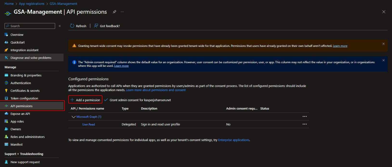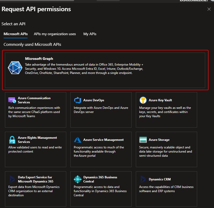 The last thing we need to do is to add permissions to the app registration. Click API permissions, Add permissions and select Microsoft Graph