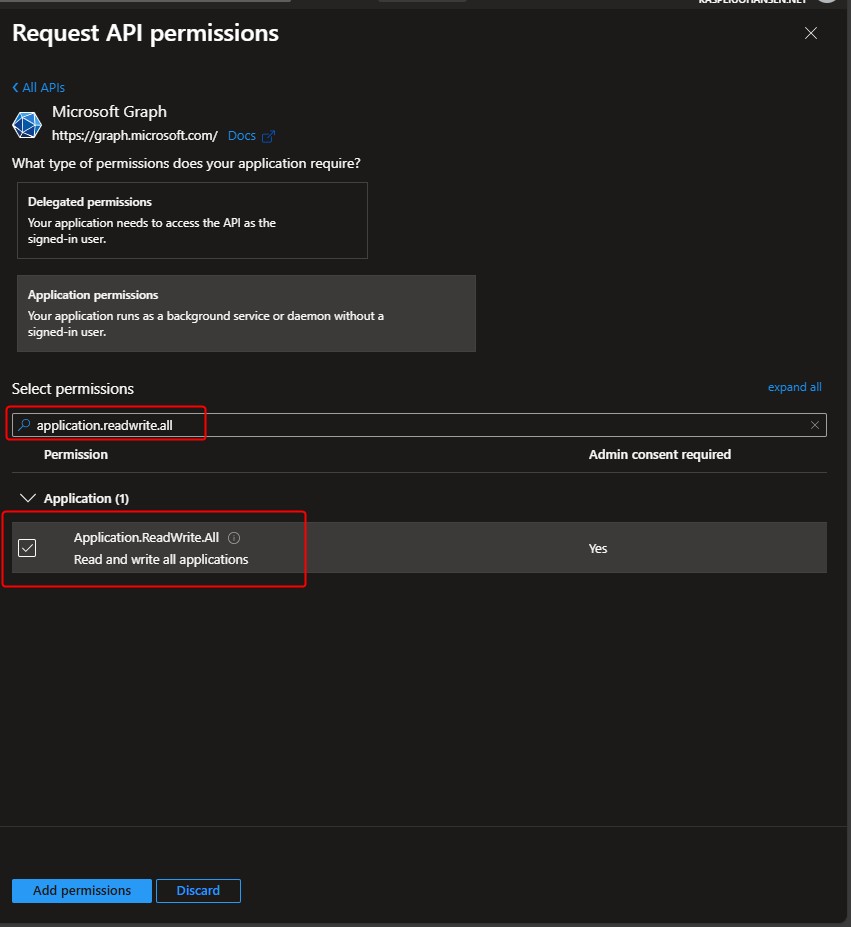 Click Application permissions. In the select permissions search box type Application.ReadWrite.All and select it in the box below the search box.