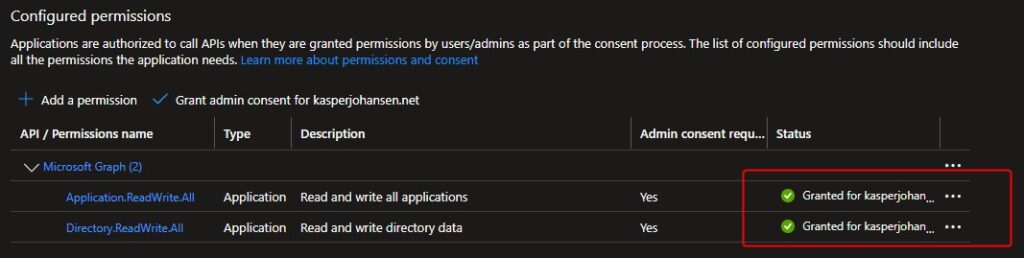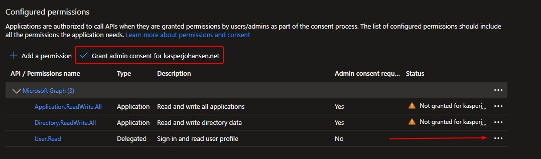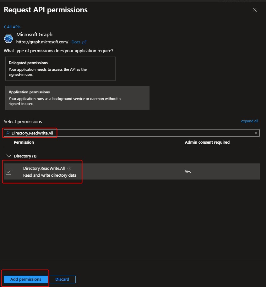 Return to the search box and type Directory.ReadWrite.All and select it in the box below the search box and click add permissions. The configured permissions should look like the second image. Make sure to remove the User.Read permissions via the 3 small dots. Next click Grant admin consent.
